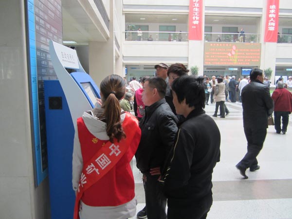 与以往的周末一样,分队队员早早地从学校北门出发,于上午8:00达到四院并开始展开服务活动。此次活动依然是以指导病人操作就医自主设备为主。由于设备刚引进不久,大部分病人对设备的操作不熟悉,这给病人和医院工作人员带来极大困扰。分队队员站立在设备旁边,热情耐心地指导就诊病人操作机器,这不仅有效地解决了这一困扰,还给就诊病人带来丝丝喜悦,多次得到人们的赞扬与感谢。此外,服务分队人员还参与了帮助病人推车、陪就医老人说话等服务活动,给病人带去了更多的关怀与祝福。
