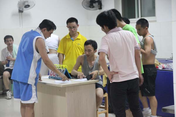 晚上七点,乒乓球比赛准时开始。曹国华总工程师简单介绍了本次活动的意义和比赛流程,期待友谊赛促进双方交流,增进友谊,丰富业余生活。第一场由矿大本硕博实践团成员孔彪硕士对阵金黄庄矿业生产支部孙峰。孔彪开局不错,一度以4:2领先,在之后的时间里却接连出现失误,被对方连续大反击,掀起得分高潮,遗憾地以5:11失掉第一局。在第二局的比赛中,双方都打的较为谨慎,不给对手抓住漏洞的机会,比分咬得很紧,交替上升。最终孙峰抓住机会,连续攻克两分,以15:13,拿下第二局,赢下第一场比赛的胜利。在接下来的较量中,实践团的健儿们尽管努力拼搏,仍不敌技术娴熟、攻守兼备矿区代表。其中,朱金佗分别以4:11,2:11不敌地测技术部的王峰;郭汝林吸取经验,改善打法,仍旧以打得很有8:11,8:11憾负安监处郑强;钮月也在两回合的较量中,以相同的比分4:11败于机运处周勇。最后一场孔彪卷土重来,丢下思想包袱,冷静对待,以11:9,11:9击败机运处张汉超,拿下了实践团唯一的一场胜利。赛后,双方队员握手致意,交换心得体会,并合影留念。