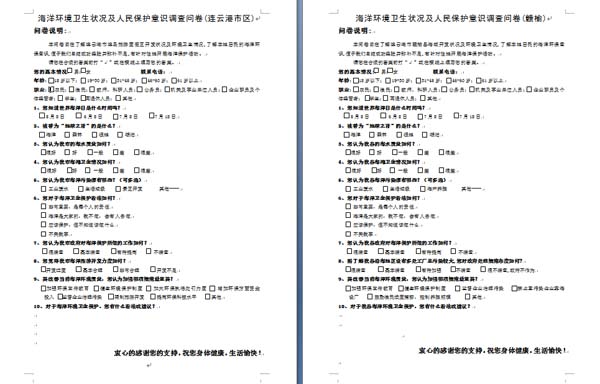 最终审定的问卷分别针对海产养殖、旅游开发拟定两套问卷,调研方向明确,针对性强,每份问卷内容共10道题,其中有9道选择题,选项设置合理,并对受访人年龄、职业做相应统计,以便问卷回收之后更精确地分析数据。问卷旨在了解连云港海域旅游、养殖开发状况及环境卫生情况,了解本地居民的海洋环保意识,便于我们总结成功经验并弥补不足,有针对性地开展海洋保护活动。