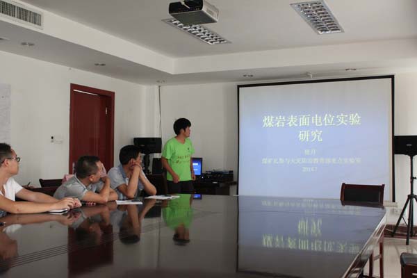 本硕博暑期社会实践团与金黄庄矿业有限公司举行本次社会实践的第二场学术交流会。本次交流会的主题为“煤岩表面电位实验研究”,由矿大硕士研究生钮月主讲,矿区总工程师曹国华等技术骨干力量与实践团成员团体参加。