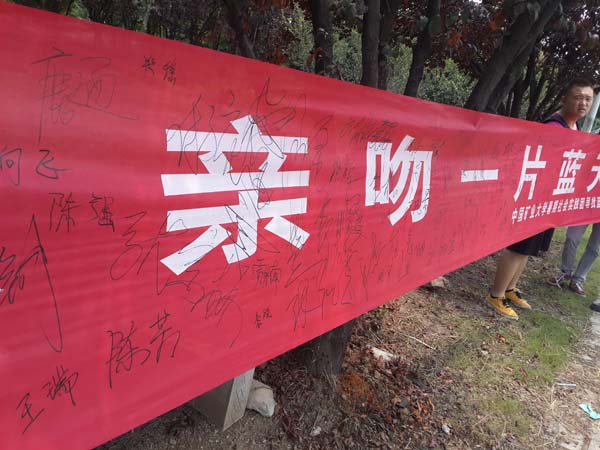 到达指定地点后,“寻找蓝天”社会实践团拉开了定制的横幅――低碳亲吻一片蓝天。横幅由团队的两名成员固定,其余成员向市中心的游客和居民宣讲环保的重要性,并给他们提供笔到横幅上签字。活动刚开始的时候,实践团的成员稍稍感到一丝害羞,不好意思向路人开口介绍此次活动,但在活动小队长鹿通的带领下,成员们逐渐的大方起来,积极的向沿路行走的人宣传环保的知识,不少市民十分赞赏实践团的行为,并愉快地在横幅中间签下了自己姓名。随着越来越多的路人在横幅上留下自己的承诺,小队成员们更加有信心使环境保护的意识扩散到人群中。不管老人还是小孩,妇女还是青年,他们都为环境的保护做出了承诺。活动过后,过往的市民纷纷将垃圾扔到了垃圾箱里,就连街道保洁人员也对实践团开展的活动赞不绝口。下午,“寻找蓝天”暑期社会实践团的成员将横幅挂在了学校二食堂的广场上,希望横幅的力量也可以让在校的同学们为环保出一份力。