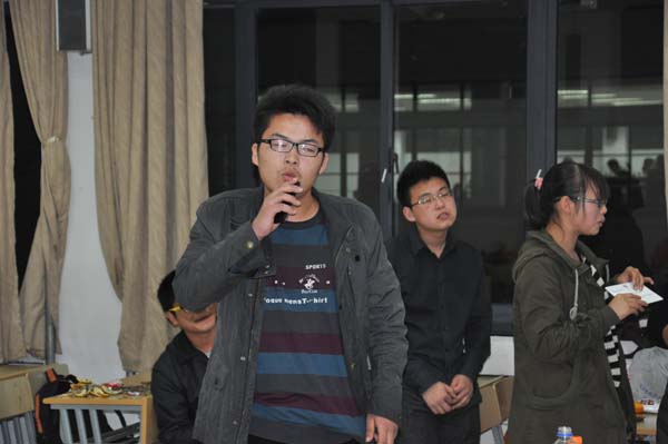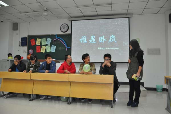 晚上7:30,活动在“谁是卧底”的小游戏中拉开了序幕。6个游戏者,1个卧底。在场6个人中5个人拿到相同的一个词语,剩下的1个拿到与之相关的另一个词语。 每人每轮只能说一句话描述自己拿到的词语(不能直接说出来那个词语),与不能让卧底发现,也要给同胞以暗示。每轮描述完毕,6人投票选出怀疑是卧底的那个人,得票数最多的人出局。若有卧底撑到最后一轮,则卧底获胜,反之,则大部队获胜。这是快乐大本营的热门游戏,同学们都很熟悉,也都积极主动地参与到游戏中,班会瞬间就掀起了一个小高潮。游戏者幽默的描述、被指认卧底的窘态都让同学们的笑声充满了整个教室,同学们间的距离就在此刻拉近,快乐其实就这么简单。随后游戏失败者祁钰和徐博雅的合唱《最炫民族风》掀起了此次活动的高潮,他们随着音乐歌唱,轻松、热情与欢快瞬间感染了现场的每一个同学,大家都沉醉于这愉快的歌声中,整个场面顿时沸腾起来,空气中好像也感染了这种欢快的气氛,直上天宇,融于纯净的月光中……