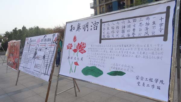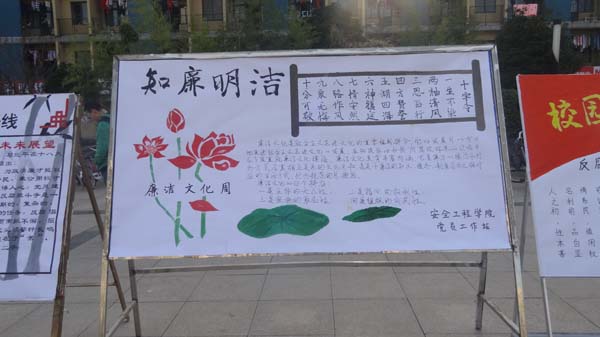 高度重视高校廉政文化建设而采取的深入推进校园廉洁教育的举措。值学校第二届“校园廉洁文化活动周”来临之际,为了认真贯彻校园廉洁文化精神,培养大学生坚定的廉洁信念,安全学院党员工作站也向全院学子提出积极参加“校园廉洁文化活动周”的倡议。近日,宣传工作相继展开,安全学院党员工作站的同学为此精心制作了宣传展板,并在11月5号于学校二食堂广场展出。在党员工作站成员的带领下,学院学生不仅认真学习领会倡议书的各项内容,也参与宣传展板的制作、展出与学习,并就此进行讨论。