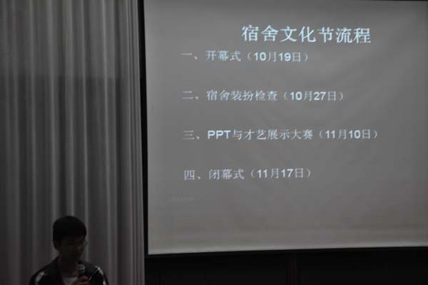 为了使新生更好的了解宿舍文化节,更好的参与各项比赛,十月十九日晚七点,矿业学院、安全学院、力建学院、机电学院、环测学院、理学院、外文学院、艺术学院和孙越崎学院联合举办的宿舍文化节开幕式在外文学院报告厅B102成功开幕。参加此次开幕式的有:嘉宾席的矿业学院执行副主席魏坤、安全学院副主席杨康、环测学院副主席李家琪、理学院副主席周伟斌和外文学院副主席郭宗煜,以及各个学院的生活部和宿舍代表。