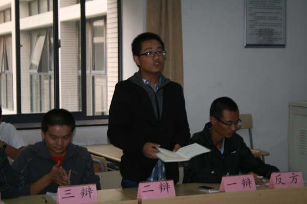 为了增强新生交流,促进安全学院大一班级间的友谊,安全学院于10月9日晚上在教四B302举行安全13-2班及13-3班的辩论赛。此次辩论赛的评委是12级曹蒙钰、陶冰冰、童天润以及莫诚同学。