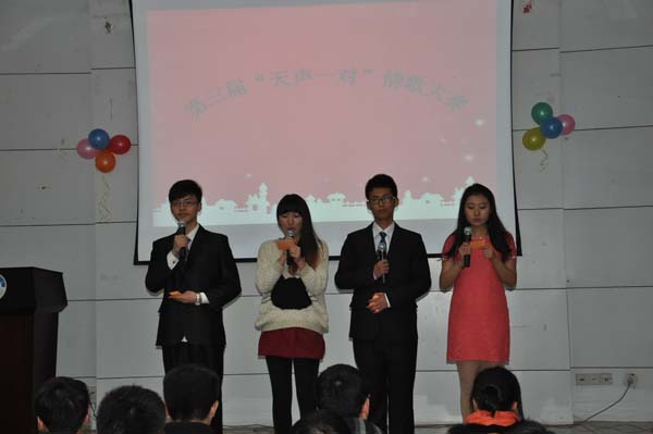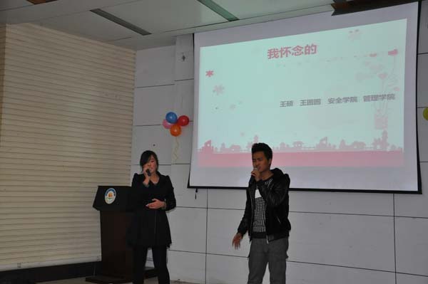、资源学院、管理学院、外文学院六院女生部联合举办的“天声一对”情歌大赛在矿业学院A604圆满落幕。本次决赛邀请了六院各团委学生会分管主席和校女生部部长担任评委。经过决赛一番紧张激烈的角逐,安全学院张捷勇,信电学院郑云龙演唱的《单身情歌》与安全学院王硕、管理学院王园园演唱的《我怀念的》荣获一等奖,安全学院牛壮、管理学院江哲慧演唱的《拥抱你》荣获二等奖。