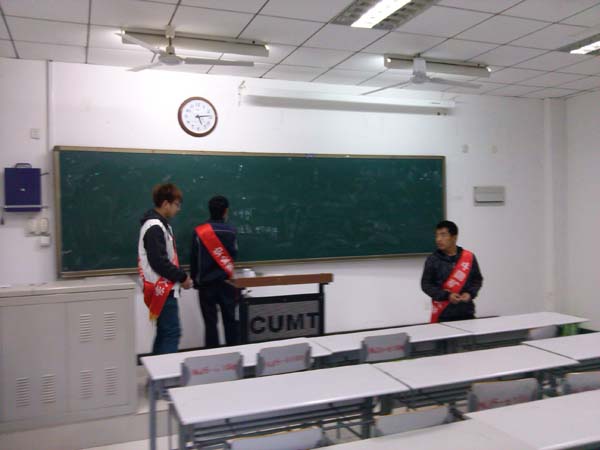 下午4时许,安全11-4班全体人员在教五大厅集合,在得到分配的任务后,所有同学分别前往自己负责的公教区。安全11-4班班长任青刚和团支书余莉带领同学们“兵分两路”进行清洁工作。同学们对讲桌,黑板和黑板下方的凹槽均进行了清理,并将空教室里面的灯关闭。