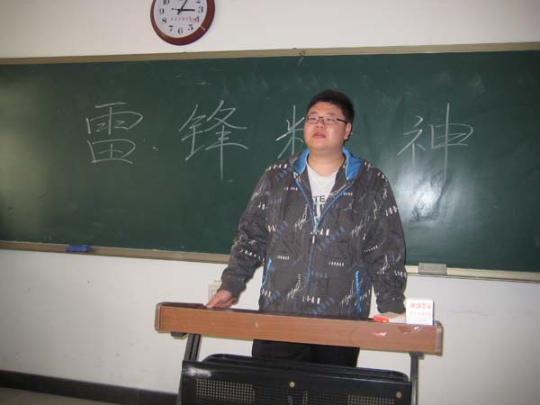 随后,针对当代青年大学生如何理解新时代的雷锋精神这一问题,在场的同学都纷纷发表了自己的看法。班长吴红姣认为,雷锋精神其实具化到生活中就是诚实、善良、勇敢、乐于助人等品质,它不应该只是一句口号,一年一次的纪念日,而应该作为人生活准则的一部分;在谈及雷锋同志的感人事迹时,学习委员刘刚指出,做志愿者工作,在雪灾、地震等灾难来临时积极奉献爱心,也是雷锋精神的具体表现,雷锋精神是一种象征,一个符号,也许我们在做好事时没有想到雷锋精神,但实际行动却是对它的最好诠释。班会进行过程中,同学们踊跃发言,讨论会气氛异常活跃。班会最后,团支书刘世通作了总结,并希望班级每个同学都能以自己的实际行动去发扬互助互爱的雷锋精神,创建一个团结互助的班集体,让雷锋精神得以延续。