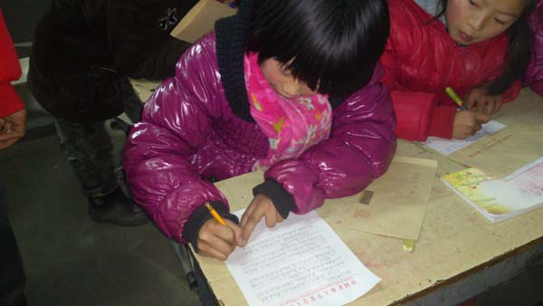 1月23日晚,中国青年志愿者公益圆梦行动“关爱留守儿童,播洒爱心阳光”爱心阳光之队组织赵河镇中心小学的留守儿童为亲人书信感恩信件,帮助留守儿童们表达自己的思念与感恩之情。