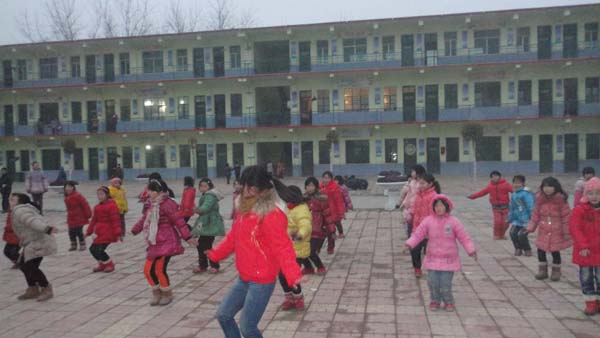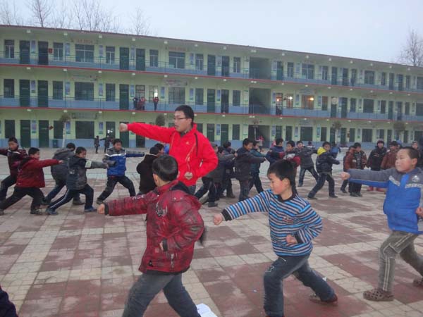 由于当地的教学条件有限,学校的体育锻炼设施不够完善,所以孩子们很少进行正规的健身训练。为此,志愿者们为孩子们精心设计了运动课程,将快乐体育融入教学实践中,为留守儿童带来了内容丰富、寓教于乐的健身体育课。在健身体育课上,志愿者们根据孩子们的爱好,准备了五步拳、健美操等运动,并为孩子演示了动作技巧。没有接触过正规的健身运动的孩子们表现出了极大的兴趣和热情,开心地学着每一个动作。志愿者们手把手地教学,同时在队伍中耐心的纠正每一个孩子的动作。渐渐地,孩子们的动作越来越标准,每一个孩子都能将志愿者讲解的健美操和五步拳完整准确的展示出来。