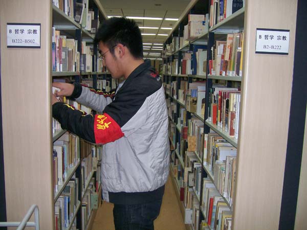 晚上8点整,服务分队D组组长蒲万琦带着五名组员到达图书馆二楼并开始组织开展活动。在管理员老师的要求与指导下,分队队员把书架上1999年以前出版的书籍全部挑选出来,做上标记,并将书架上的书籍摆放整齐。据悉,至从安全学院学生服务分队“图书馆共建”活动开展以来,每周的周一、周二晚上都会有分队队员到图书馆进行服务活动,比如将书籍摆放整齐,清理书架上的灰尘等。这些活动看似简单,操作起来却很累人。整理书架时一不小心就会出现失误,同时由于书的量很大,在检查时也有一定的困难,队员们经常得在一个书架上花很多时间仔细查找,以避免出现"返工"现象。活动一直到九点半才结束。