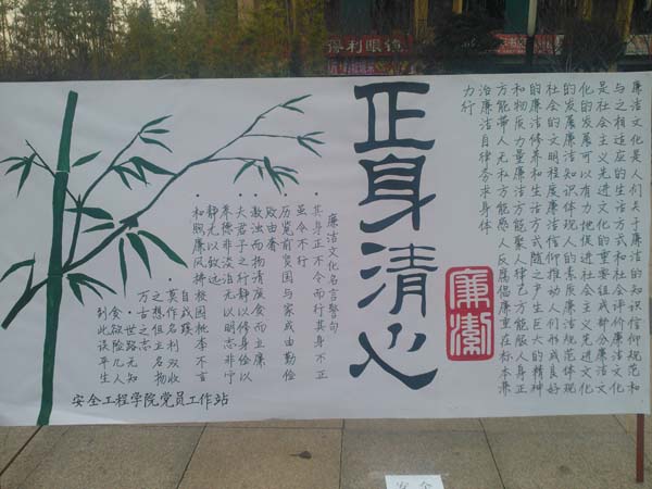 党员工作站所制作的展板中,展出了廉洁修身和大学生的关系,加强廉洁教育的方法以及古今中外关于廉洁的名言警句,以强烈的艺术感染力,真正体现了“和煦春风拂校园,桃李不言自成蹊”的境界。精彩的画面,鲜活的案例,深刻的语言吸引了众多路过的学生驻足观看。
