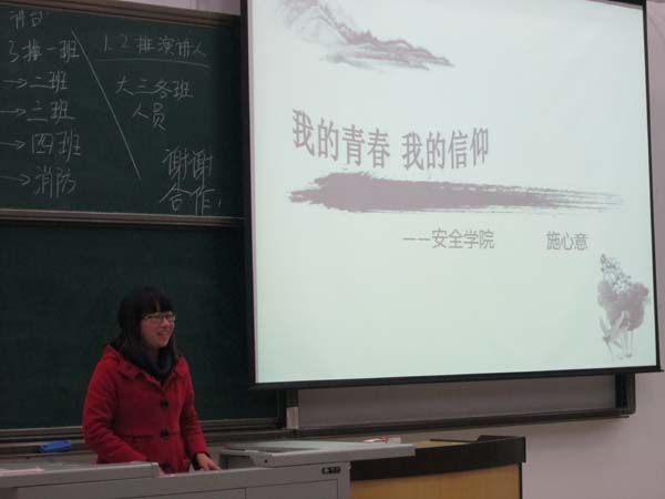 报告会由安全09-4班团支书涂庆毅同学首先发言。他回顾了自己的工作历程,并从中总结出:一个好的团支部要有凝聚力,作为团支部的一员,要有责任心,要善于总结工作经验。期间,他用一句“付出总是比得到的少”来劝勉同学们,希望大家无论是对待工作还是学习都要用认真的态度去努力奋斗。其后发言的是徐超航同学。徐超航同学成绩优异,他从学习目标,学习态度和时间分配等方面来谈如何取得好成绩。第三个发言的是施心意同学,她从自身经历出发,向同学们讲述自己对大学生活的见解。之后发言的是何选泽同学,他的发言风趣幽默,大学生活丰富多彩。给同学们带来欢乐的同时,也让大家有了新的想法。随后,王鹏飞、张捷勇、李灿以及消防10-1班代表各自做了发言。