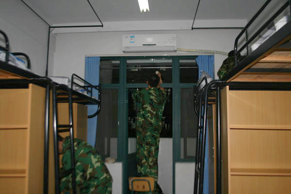 12级新生在军训中将自己当做军人,积极学习着怎样做一个合格的军人,他们对自己的严格要求将促进他们早日成为一个合格的大学生。虽然,新生们经过一整天高强度的军事训练课程早已疲惫不堪,但他们对宿舍内务打扫仍然不敢有丝毫的懈怠。对照军训内务评比的具体要求,新生们在打扫时逐一对照落实,分工合作,在劳动成体会军训的乐趣。夜晚十点半,经过师生们的共同努力,新生宿舍里窗明几净,地板砖光亮整洁,墙壁白亮如新,有棱有角的“豆腐块”被子更显同学们的认真与用心。虽然大家来自五湖四海,但在学院荣誉的感召下,同学们不仅创造了洁净的宿舍环境,也在这样的集体努力中迅速建立了信任与情意。