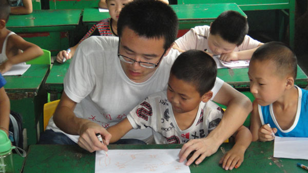 关爱留守儿童暑期社会实践团来到河南省南阳市方城县博望镇新星学校幼儿部进一步展开实践活动,与幼儿部的孩子们进行了亲密互动。