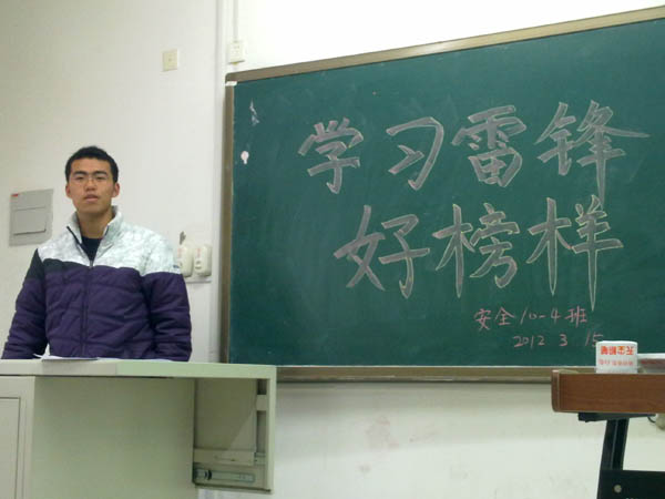 为更深入学习雷锋精神, 3月15日上午,安全10-4班在教五B106教室顺利召开了“学习雷锋好榜样”主题班会,安全10-4班班主任吴征艳老师出席了班会,班级全体同学参加了此次班会。班会由团支书闫一鸣同学主持。