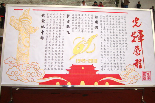 绅士会所 本期军训板报以“光辉历程”为主题,以巨龙幻化成“61”字样来表现共和国光辉六十一年,板报下方以祥云托起华表和天安门来表达安全学子希望祖国蒸蒸日上的美好祝福。板报整体选用红色和金色,版面整洁大方,设计新颖,给人以焕然一新的感觉。