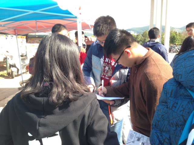 中午12点,活动正式开始,安全学院心理自助中心成员在三食堂广场进行活动现场报名宣传。一部分成员向同学们发放传单并介绍此活动,吸引来往同学的注意,同时也耐心的为咨询的同学讲解活动的参与方式。另一部分同学留在活动站点做好登记工作,同时进行数据的统计。现场气氛活跃,同学们共同努力维持现场秩序。13点30分,活动结束。