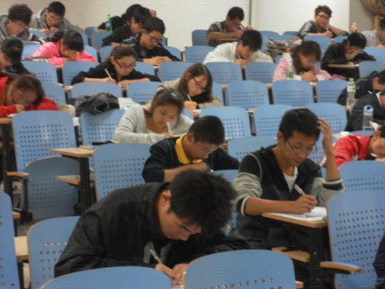 同学们对这次考试都很重视,开考前20分钟就悉数来到教室对有关知识进行回顾复习。离正式开考还有3分钟时开始发放试卷,同学们拿到卷子后首先纵览全卷然后开始认真作答。答卷期间,同学们都聚精会神地埋头于自己的试卷中。监考人员认真负责,严肃考纪,坚决杜绝了违反考试纪律的行为。整场考试秩序井然,行为规范。