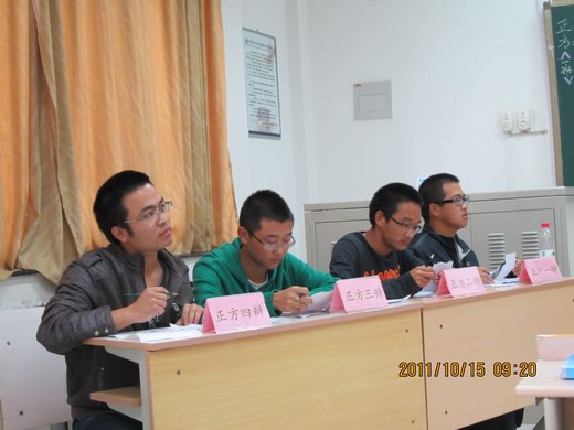 2011年10月15号上午,由安全学院学生会科创部主办的新生辩论赛半决赛在教5A103教室成功举行。本轮比赛由汤宗情、路世远、何选择、王彩虹等10级优秀辩手担当评委。上午九点举行的第一场的对阵双方分别为安全11-3班和安全11-1班,双方围绕勤工助学利大于弊还是弊大于利展开了激烈的辩论。