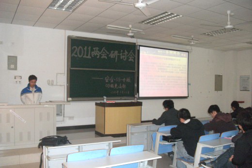 研讨会开始,由班长孙乘育用PPT的形式给大家介绍了一下两会的由来,然后给大家回放温家宝总理做政府工作报告的视频,介绍了两会的一些热点问题,如:十二五规划、通货膨胀、调控房价等。还给大家展示了两会的一些数据和图片。同学们在了解完相关资料后展开了热烈的讨论。汤研同学说,这次两会突出了民生问题,从三农政策和医保问题可以折射出政府在下决心帮助低收入群体。另外温总理的政府工作报告也非常务实。作为一名学生党员,我们一定要坚信政府的决策力,对解决当下问题充满信心。其他同学还提到了就业、通货膨胀、十二五规划等问题,都结合两会和自身的想法做了精彩的发言。