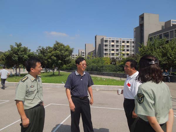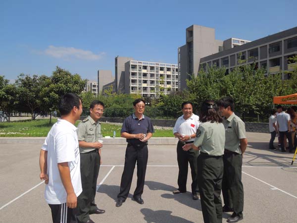 新生军训地点视察了安全学院13级新生的军事技能训练工作,并对新生的训练进行指导。学院孙留涛与孙婷老师为校领导们详细的介绍了安全学院新生军训情况。