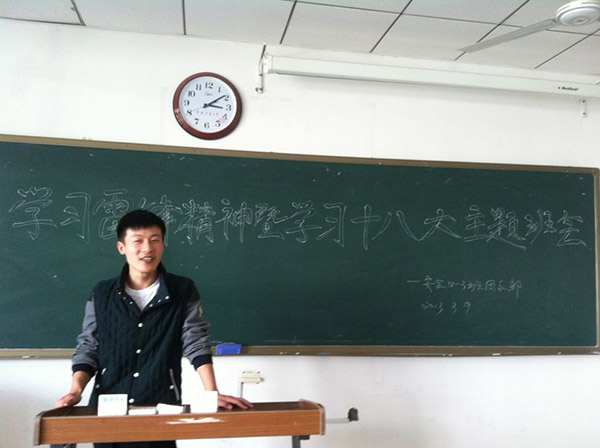 为响应学校学习雷锋的号召,3月23日,安全学院安全10-3班在教四C208开展了关于学习雷锋精神的主题班会。会议由团支书刘东一同学主持,安全10-3班全体同学参加了此次班会。